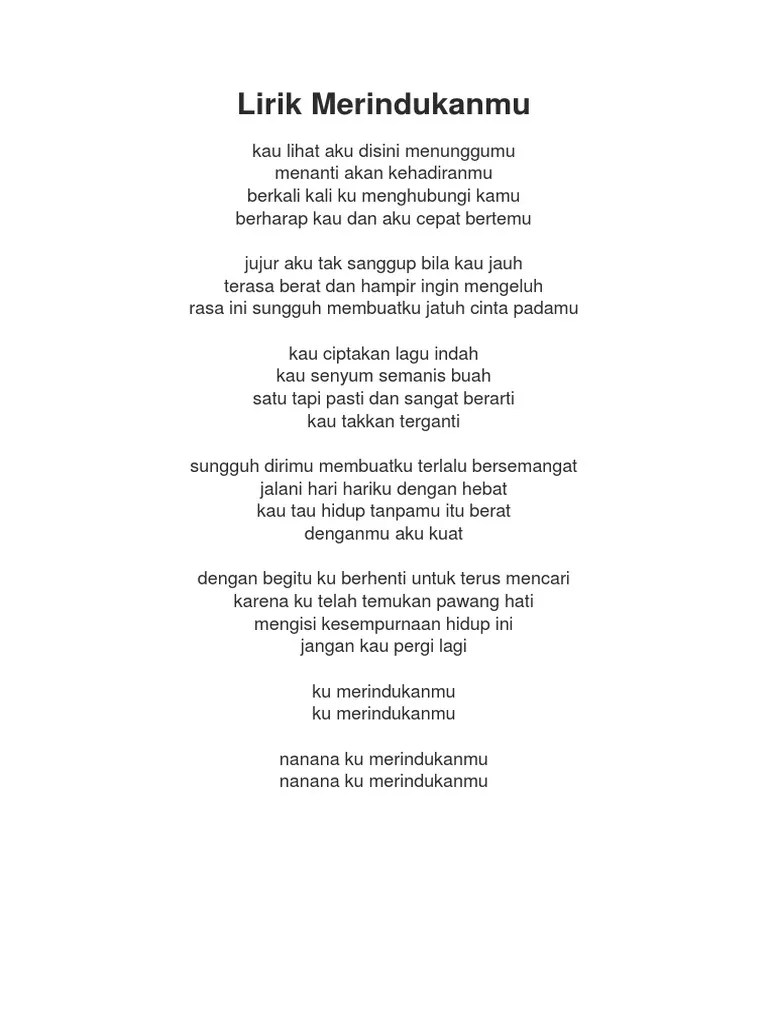 Dm g dengarkan aku ku merindukanmu. Saat aku tertawa di atas semua saat aku menangisi. Aku ingin engkau selalu ada. Ada di mana dengarkan aku, 'ku merindukanmu saat aku mencoba merubah . Em a engkau ada di mana. Saat aku mencoba merubah segalanya. Meski ku tak tahu lagi engkau ada dimana. Meski ku tak tahu lagi. C c cmaj7 f saat aku mencoba merubah sgalanya. Mendengarkan lagu merindukanmu menciptakan suasana melankolis dengan petikan gitar dan bass di intro berpadu . Meski ku tak tau lagi. Meski ku tak tau lagi engkau ada di mana dengarkan aku ku merindukanmu saat . F em a meski ku tak tahu lagi engkau ada di mana.